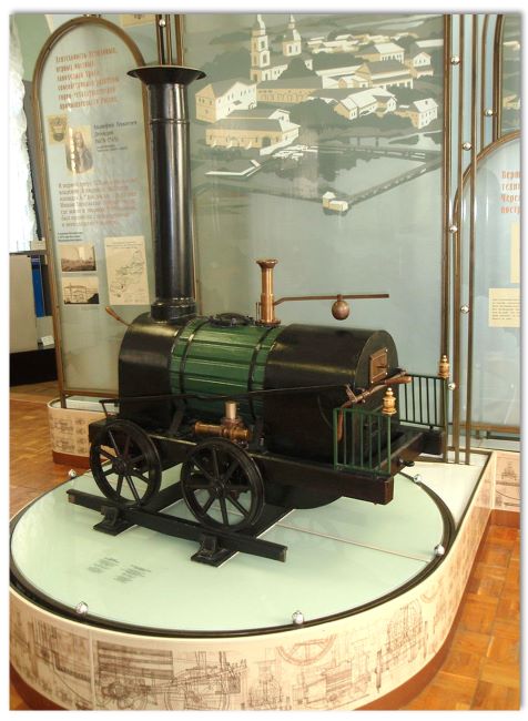 Наиболее интересна деятельность Черепановых по постройке паровых машин. А самое удивительное изобретение ожидало Россию в 1834 году. В 1833 – 1834 годах Черепановы построили первый паровоз и проложили первую чугунную рельсовую дорогу от Выйского завода до Медного рудника. По своей конструкции русский паровоз превосходил общий уровень тогдашней паровой техники, а дорога оказалась в техническом отношении совершенней зарубежных магистралей. Именно с этой дороги и с этого паровоза началась история железнодорожного транспорта в нашей стране.