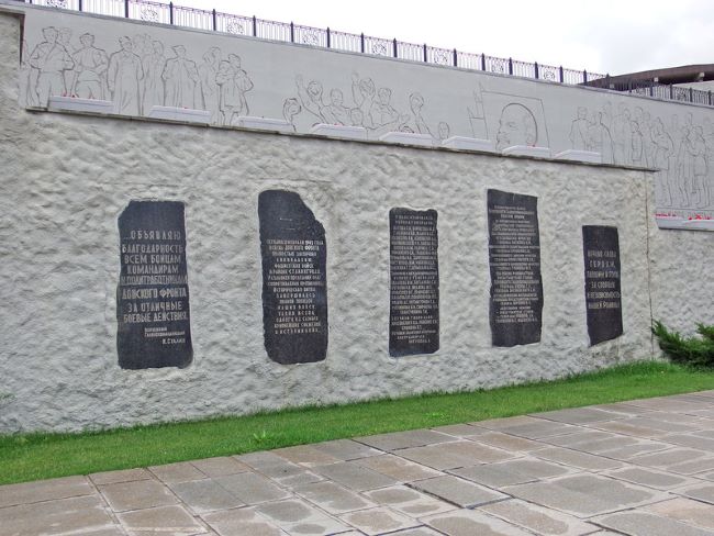 Другую сторону водяного партера окаймляет более чем 100-метровая стена, выполненная в виде развернутого знамени. Вдоль всей стены крупными рельефными буквами надпись: «Железный ветер бил им в лицо, а они шли вперед, и снова чувство суеверного страха охватывало противника: люди ли шли в атаку, смертны ли они?!»