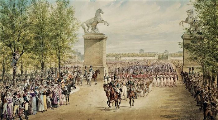 Парад русский войск на Елисейских полях в Париже в 1814 году.