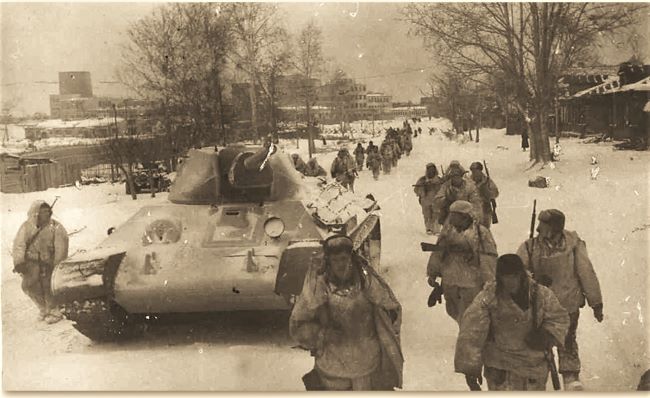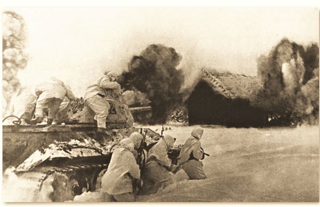 Советский танковый десант Западного фронта при поддержке танка Т-34 атакует занятую противником деревню.