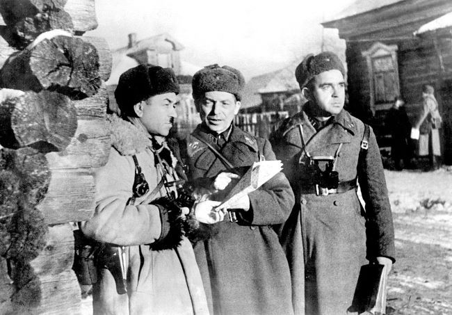 Генерал-майор И. В. Панфилов, полковник И. И. Серебряков, комиссар С. А. Егоров. 18 ноября 1941 г.