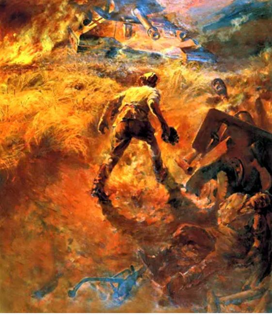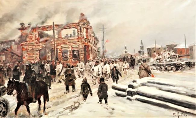 В феврале 1944 года художник становится свидетелем одной из самых значительных операций Красной армии – Корсунь-Шевченковской – на Украине. Здесь была разбита и уничтожена крупная группировка фашистских войск. И в своей композиции «Корсунь-Шевченковское побоище» автор весьма впечатляюще показывает разбросанные на многие километры по заснеженному полю трупы врагов, груды искорёженного, разбитого, обгоревшего металла – то, что осталось от фашистских танков, самолётов, орудий, машин. Это было истинное побоище.