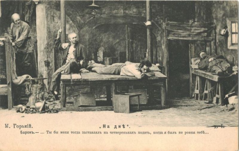Одно из самых ярких и сильных драматических произведений писателя начала 1900-х годов – пьеса «На дне». Действие пьесы разворачивается в ночлежке Костылева. В этом подвале, похожем на пещеру, оказались люди самого различного характера и социального положения. Но их объединяет одно – все они выброшены из жизни «на дно» в силу условий, царящих в обществе. Страшная участь обитателей ночлежки становится особенно очевидной, если ее сопоставить с тем, к чему призван человек. Под темными и угрюмыми сводами ночлежного дома, среди жалких и искалеченных, несчастных и бездомных бродяг звучат гимном слова о человеке, о его призвании, силе и красоте.