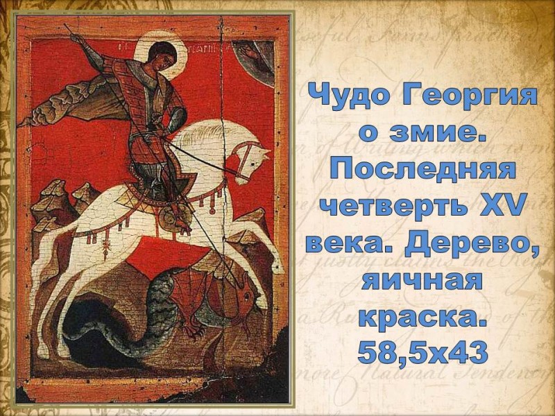 Икона «Чудо Георгия о змие» относится к новгородской иконописной традиции. Для неё в отличие от владимиро-суздальской или московской были характерны более контрастные и яркие сочетания цветов, четкий рисунок, упрощенные, иногда грубоватые формы. Новгородские иконописцы чаще всего изображали святых, оказывающих помощь в конкретных делах: ратных, торговых или хозяйственных.