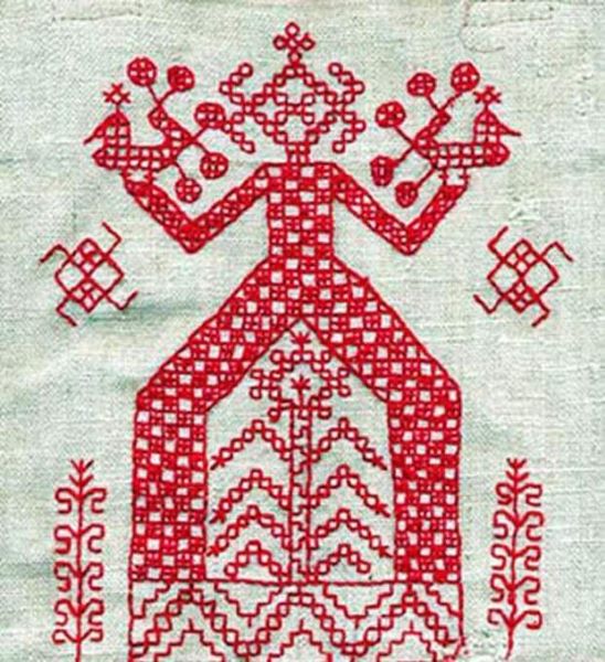 Один из распространенных сюжетов вышивки – трехчастная композиция расположения женских фигур. Она имеет два основных варианта. На одних вышивках персонажи поднимают руки к небу, на других подчёркнуто опускают руки к земле. Поднятые вверх руки персонажей вышивки несут «идею встречи» небесной благодати. Опущенные вниз руки центральной фигуры вышивки обращены к земле, дающей урожай. Такая последовательность повторов фигуры женщины напоминает многократную молитву на урожай.