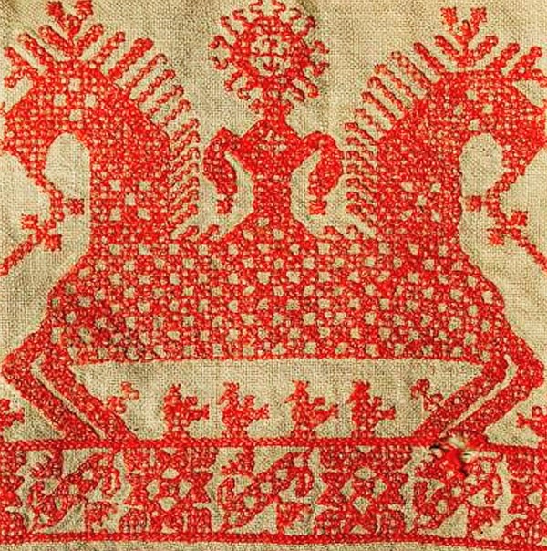 Частым сюжетом русской вышивки является Конь. Он наделён божественной силой и считался знаком солнца и неба. Конь, конник, колесо – равнозначные знаки солнца и тепла, приносит в дом счастье и благополучие. Вышитые сюжеты с мотивом коня многообразны. Например, кони-птицы или кони, расположенные по сторонам женской фигуры или цветущего дерева. На конях часто изображали всадниц – богинь весны. Часто встречаются двуликие кони и даже четырёхкратное изображение коней, символизирующие четыре стороны света. Конники – знаки времён года, знаки зимнего и летнего равноденствий, которые отмечал народ праздниками и обрядами.