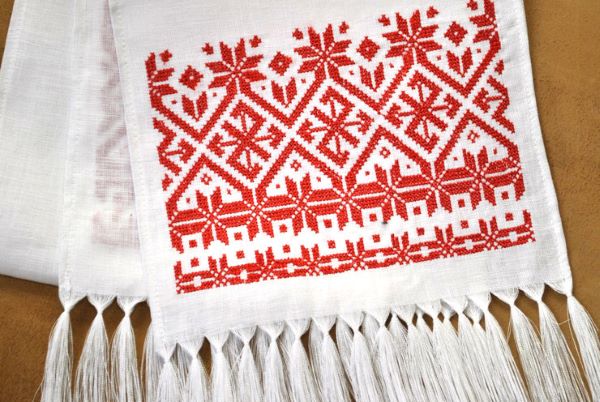 В славянской традиции ромб – один из самых любимых знаков. На женской одежде он встречается чаще, чем на мужской; но и женщины и мужчины носили пояса, украшенные ромбовидным орнаментом. Ромб – безусловный оберег. Это знак земледельцев, символ родящих зерно полей, символ счастливого потомства. Ромбы изображали на кухонной утвари, вырезали на фасадах домов. Считалось, что семья, охраняемая ромбами, живёт в достатке и всегда будет многочисленна. В вышивке разных народов он выглядит по-разному и имеет различные значения. Ромбы с продолженными сторонами и со сторонами, снабженными «гребешками», назывались репьями. Ромб - "репей" в фольклоре сравнивается с дубом, священным деревом многих народов, и является метафорой небесного "цвета" - молнии, которая разит демонов, оберегает скот. Также в орнаменте использовались ромбы с «крючьями», между которыми помещались маленькие ромбики. Ромб мог обозначать землю, растение и женщину одновременно. Различные ромбы были символами плодородия, они как бы изображали крестьянские поля: ромбы с точками – это символ засеянного поля, ромбы-«репья» - символ огороженного участка земли, ромбы с рожками и завитками – символ семени.