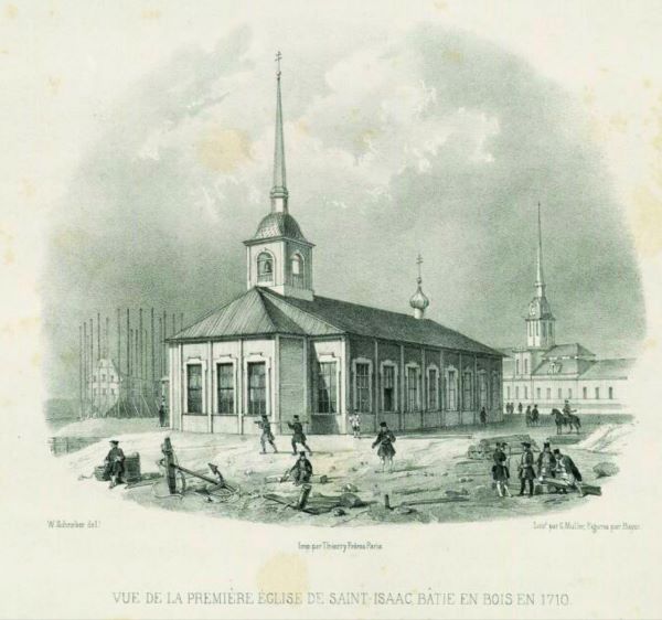 Первая Исаакиевская церковь начала действовать в 1710 году, но нынешний облик она приобрела после нескольких перестроек. В 1707 году на Адмиралтейском лугу была построена небольшая деревянная церковь, отличавшаяся скромностью архитектуры, характерной для первых зданий Петровской эпохи. В этой Исаакиевской церкви 1 марта 1712 года был совершен обряд венчания Петра I и Екатерины I. Но здание, слишком непритязательное по композиционному и художественному решению, не соответствовало архитектурному облику столицы. И 17 августа 1717 года по проекту архитектора Г. И. Маттарнови на берегу Невы, там, где теперь стоит памятник Петру I («Медный всадник»), при личном участии императора была заложена вторая Исаакиевская церковь. Архитектура ее напоминала сохранившийся до наших дней собор Петра и Павла в Петропавловской крепости, построенный по проекту Доменико Трезини. Но место для строительства новой церкви было выбрано неудачно: берега Невы еще были не укреплены. Начавшееся оползание грунта вызвало трещины в сводах. В мае 1735 года возник пожар, довершивший начавшиеся разрушения, в результате чего было принято решение – церковь разобрать. Строительство третьего храма затянулось на десятилетия, первоначальный архитектурный проект пришлось изменить, поскольку нужно было сократить сроки строительства. В итоге было построено приземистое здание, не гармонирующее с парадным обликом столицы. Это заставило правительство и Синод уже через семь лет после окончания строительства задуматься о перестройке собора.