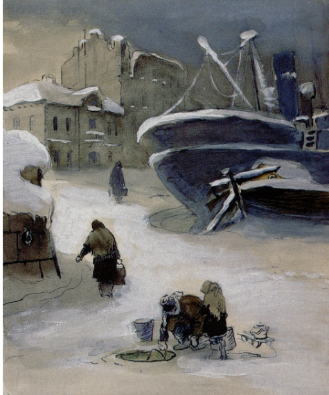 | Г. Фитингоф «За водой на Неву». 1942 | А. Заколдин-Митин «Зенитки на Неве» 1942 |