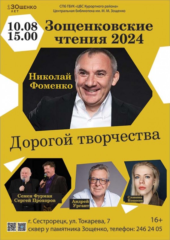 10 августа в Центральной библиотеке имени Зощенко в г. Сестрорецке состоялась музыкально-литературная программа «Дорогой творчества». В ней приняли участие Семен Фурман, Славяна Кощеева, Андрей Ургант и Николай Фоменко. В их исполнении прозвучали тексты произведений Михаила Михайловича и других авторов.