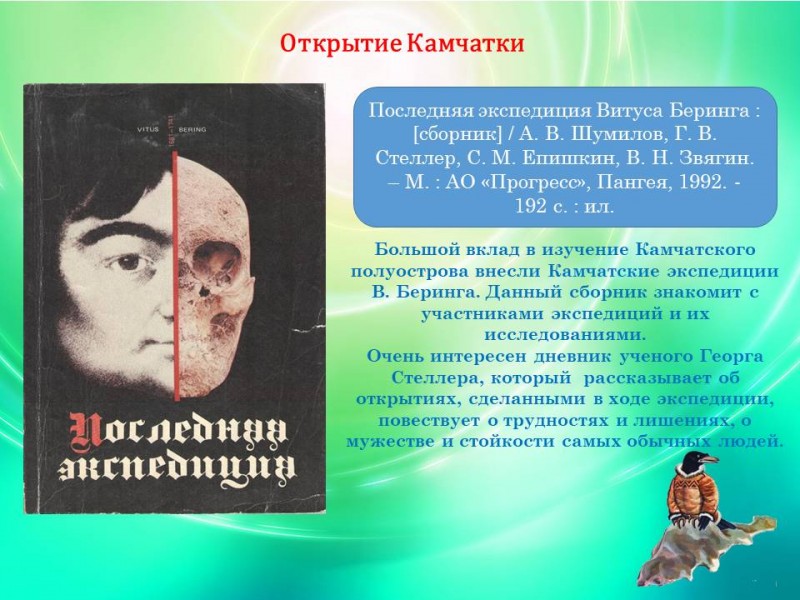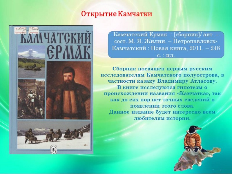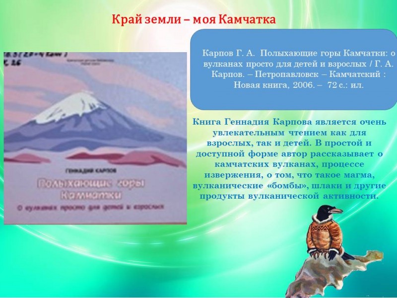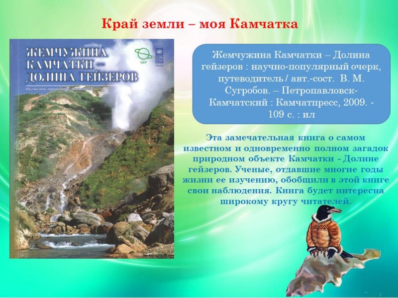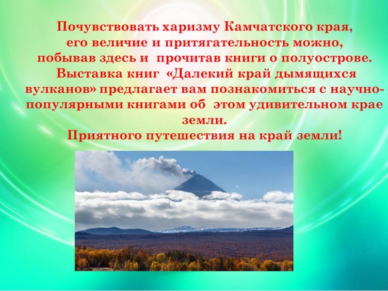 На Камчатке можно увидеть удивительные снежные вершины, чистейшие высокогорные озера, кипящие рыбой бурные реки, уникальные природные парки и заповедники, горячие источники и гейзеры. Не удивительно, что , несмотря на свою удаленность Камчатка влечет к себе туристов. Почувствовать харизму Камчатского края, его величие и притягательность можно,побывав здесь и прочитав книги о полуострове.