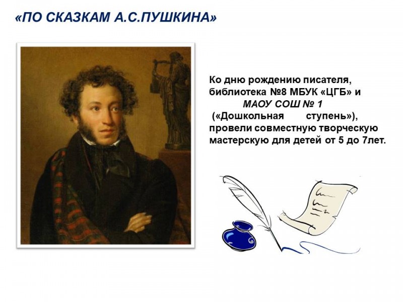 6 июня вся наша страна отмечала День памяти великого русского поэта Александра Сергеевича Пушкина. Коллектив библиотеки № 8 провел совместно с сотрудниками дошкольной ступени МАОУ «Средняя школа № 1» мероприятие, посвященное этому событию. Воспитанникам старшей и средней групп была продемонстрирована виртуальная книжная выставка «Путешествие по Лукоморью». Впечатлённые этим показом дети (26 человек) приняли участие в творческой мастерской «Мир сказок Пушкина». С работами участников этой мастерской предлагаем вам познакомиться.