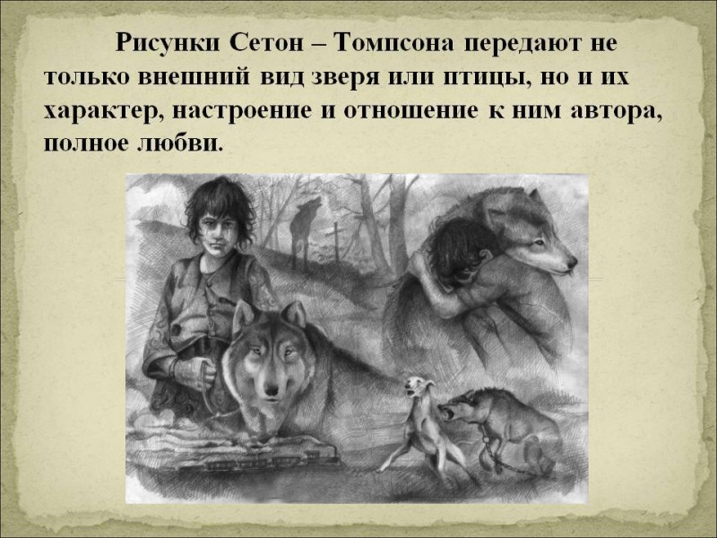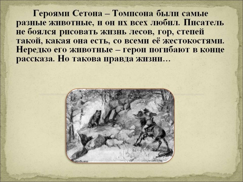 Сетон-Томпсон чрезвычайно правдиво и точно описывал действия, поступки и повадки животных. Нет отступления от жизненной правды в том, что птицы и звери как-то по-своему любят и ненавидят, и иногда с необычайной силой, что преданность их доходит до самопожертвования. Нет другого такого писателя, который бы так увлекал школьника любовью к животным, пробуждал бы страстный интерес к ним читателей во всех странах.