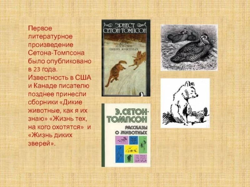 С 1890 по 1896 Сетон Томпсон изучал изобразительное искусство в Париже. Первый сборник, вышедший в 1898 году, имел огромный успех. Книга открывала читателям неведомый им мир. До половины XIX столетия большинство даже ученых людей считало, что животный мир существует сам по себе, а человечество само по себе. До выхода в свет трудов Дарвина никто всерьез не писал рассказы из жизни животных. Сетон-Томпсон первый в мире выступил с рассказами, где героями были настоящие звери и птицы. Изучению этих героев он посвятил свою жизнь - и хорошо знал и понимал их. До сих пор были известны только басни, сказки, где животные разговаривают и ведут себя как люди. В этом огромная заслуга писателя.