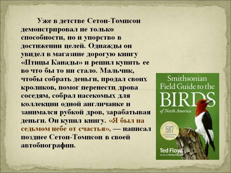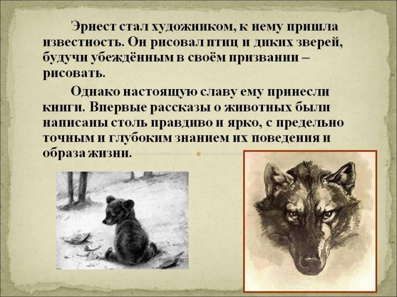 Томпсон родился 14 августа 1860 года в британском городе Саут-Шилдс, и когда ему было 6 лет, семья переехала в Канаду. Юный Эрнест часто уходил в лес, чтобы изучать и рисовать животных. Птицы и звери волновали его больше всего на свете, и чем больше он рос, тем сильнее. Ни отсутствие книг по естествознанию, ни суровый отец, ни болезни – никакие препятствия не могли помешать ему идти дорогой, по которой звала его с детства неутолимая страсть разгадывать все тайны и загадки в жизни птиц и зверей, страсть рассказывать об этих тайнах людям и передавать красоту животных в рисунках. Его иллюстрации к рассказам отличаются точностью и выразительностью.