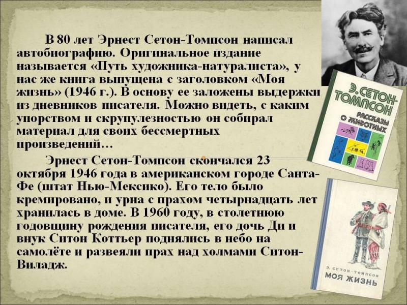 В этом году исполняется 160 лет со дня рождения канадского писателя, художника-анималиста, естествоиспытателя и общественного деятеля Эрнеста Сетон-Томпсона. Так как Соединенные Штаты играли в его жизни почти столь же значительную роль, что и Канада, его по праву можно назвать также американским писателем.