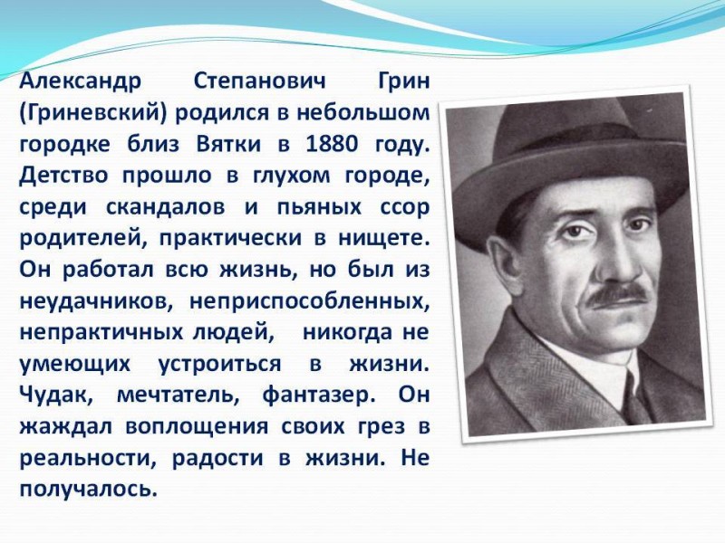 Будущий писатель рос мечтательным и рассеянным мальчиком. Учился он плохо, но запоем читал Майн Рида, Жюля Верна, Густава Эмара и Жаколио. Когда мать умерла, отец женился снова, родился ребенок. Семье Грин был в тягость. Отец раздобыл ему 25 рублей и с мечтой о морской службе Александр Грин отправился в Одессу. Там произошла первая встреча с морем – тем морем, что залило потом ослепительным светом страницы его рассказов.