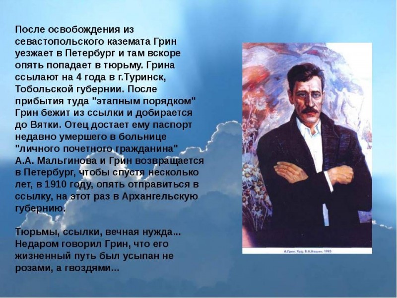 Грин прожил тяжелую жизнь. Было непонятно, как этот угрюмый человек пронес через мучительное существование дар доброго воображения, чистоту чувств и застенчивую улыбку. Жизнь была ограничена обывательской Вяткой, грязной ремесленной школой, ночлежными домами, непосильным трудом, тюрьмой и хроническим голодом. Но где-то за чертой серого горизонта сверкали страны, созданные из света, морских ветров и цветущих трав. Там жили люди, коричневые от солнца, - золотоискатели, охотники, художники, неунывающие бродяги и моряки.
