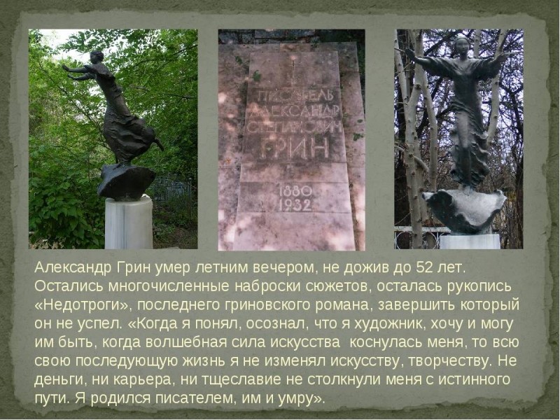 В 20-м году, во время службы под Псковом, заболел тифом, из больницы вышел почти инвалидом. Из глубокого отчаяния его спас Горький. Грину дали паек и комнату, а главное – работу. В 24 году писатель переехал в Феодосию, там он много писал. В момент раздумья был почти глух и слеп, и вывести его из этого состояния было трудно. Осенью 1930 года переехал в Старый Крым, где мучительно умирал от рака желудка и легких. Так же мучительно как и жил.