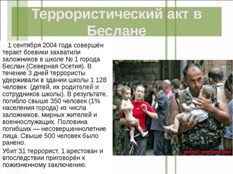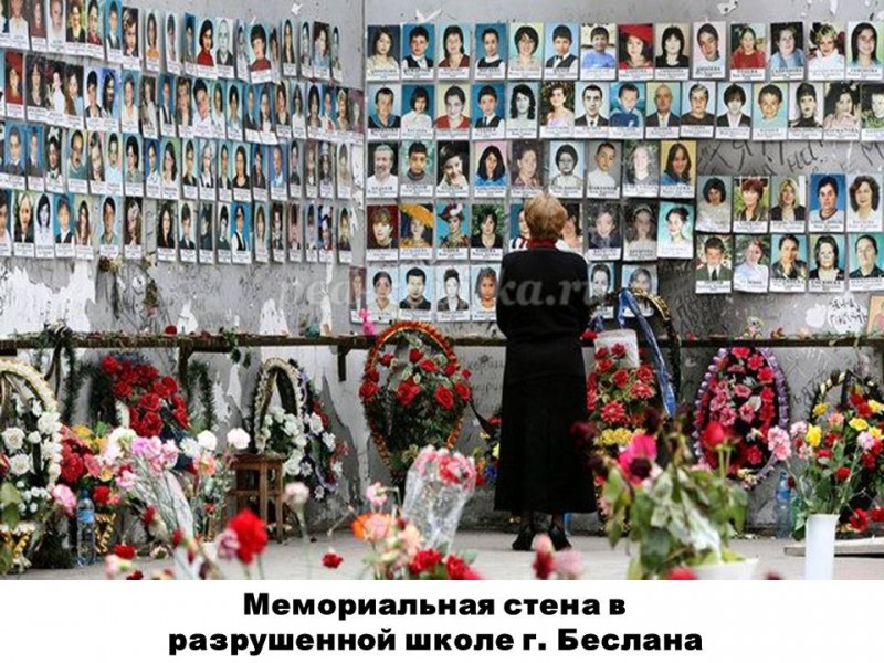Любой террористический акт, война — это боль, слезы, горечь. Это страшное потрясение для здравомыслящего человека. Страдают ни в чем неповинные люди. Погибают дети. В первые сентябрьские дни в школе №1 г. Беслана террористы удерживали 1128 заложников. Погибло свыше 350 человек. Ранено около 500 человек. Из них 186 детей. Самому маленькому из погибших исполнилось 6 месяцев.