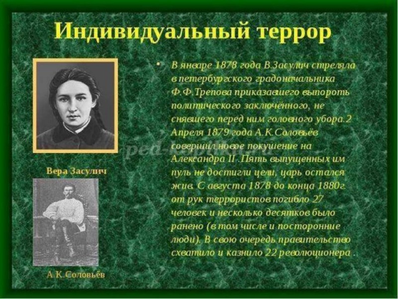 Первый терроризм случился в 1878 г, это революционный терроризм в Российской империи ещё в период правления Александра Второго. В Российской империи основным видом террора были индивидуальные убийства революционерами высокопоставленных чиновников.