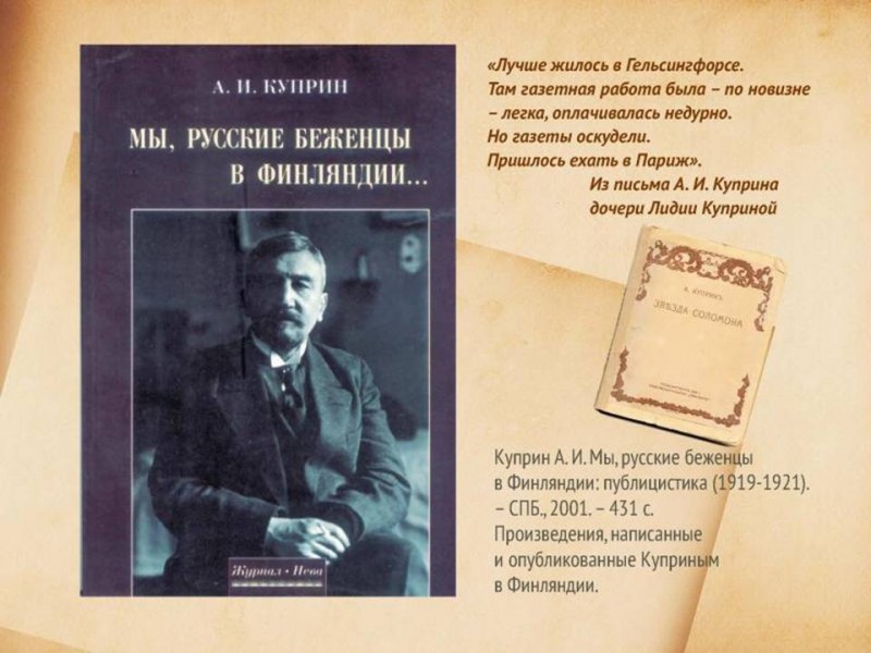 Куприн с восторгом принял февральскую революцию, но сомневался в подлинно народной сущности Октябрьской. В 1919 году он эмигрировал во Францию. За границей он тяжело тосковал по России, почти бросил писать и, наконец, весной 1937 года вернулся в родную Москву. Он был тяжело болен и умер 25 августа 1938 года. «Даже цветы на родине пахнут по-иному», - написал он перед самой смертью, и в этих словах выразилась вся его глубочайшая любовь к своей стране.