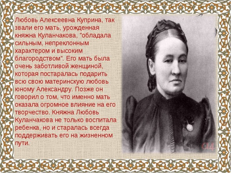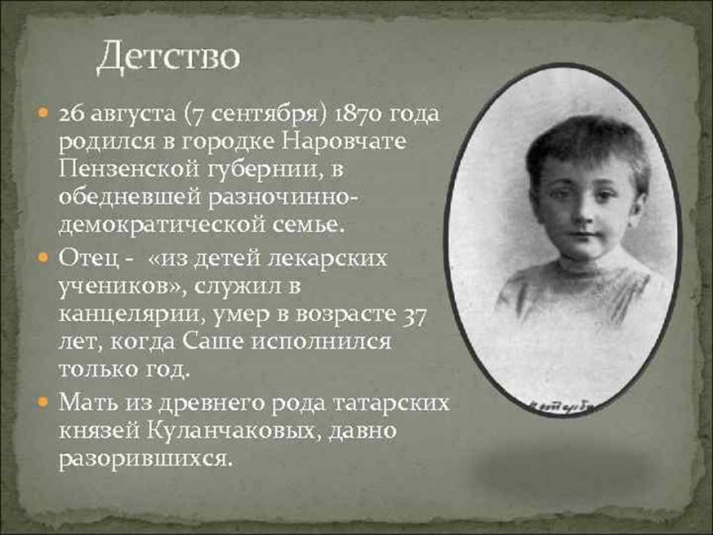 Александр Иванович Куприн родился 8 сентября 1870 года в городе Наровчате Пензенской губернии. Отец умер рано, и у мальчика началась сиротская жизнь в пансионе.