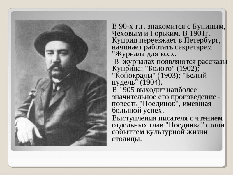 В 1891 году Куприн выходит в отставку и начинает работать в киевских газетах. Он изъездил всю Россию, стал знатоком своего народа и его описателем. В нём не было тщеславия. Дружа с литераторами, Куприн не изменял своим старым друзьям из рабочих, рыбаков, крестьян и матросов. Он превосходно знал русский язык, местные диалекты и жаргон, вплоть до «блатного». Владел способностью характеристики всех прослоек русского общества при помощи диалога.