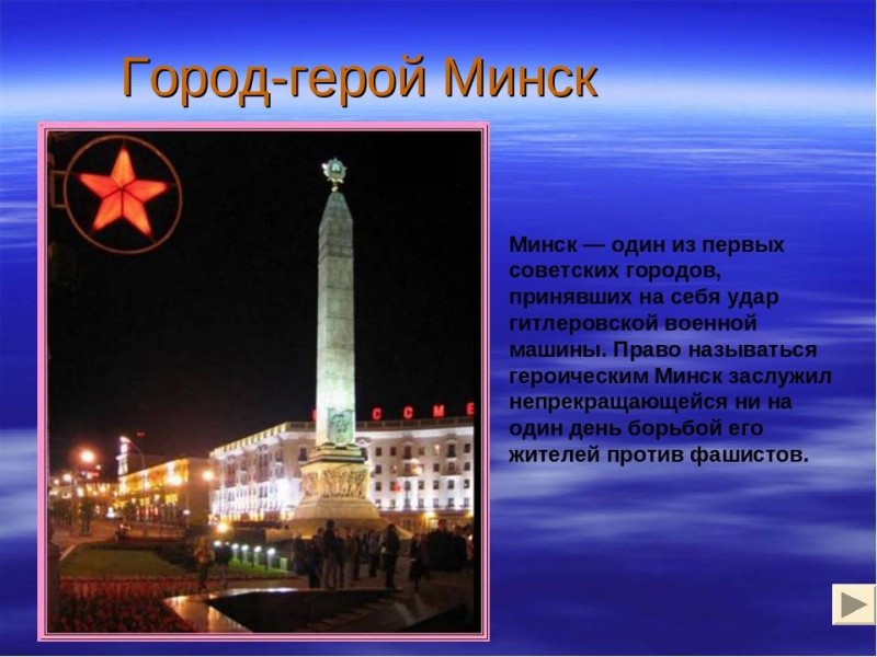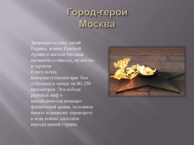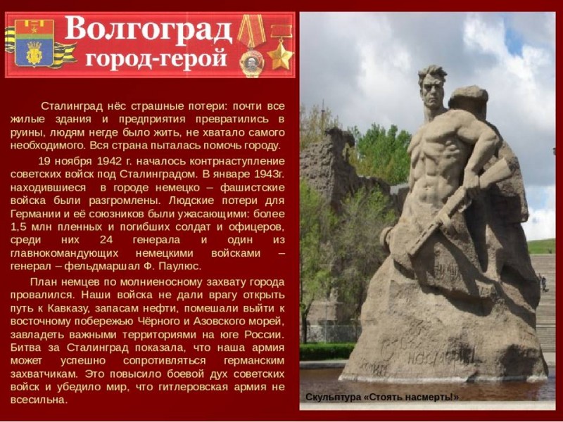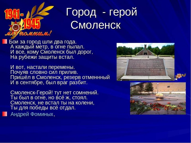 75 лет назад наши прадеды одержали победу в небывалой в истории битве с фашизмом. Мы никогда не забудем подвиги тех, кто добывал её в тяжелейших боях на фронте и в тылу, кто отстоял независимость нашей страны, а затем восстанавливал её из руин в трудное послевоенное время. С годами мы все больше понимаем историческое значение этой Победы. Глубочайшего уважения и благодарности заслуживает каждый участник Великой Отечественной войны. В её истории немало примеров массового героизма, отваги и стойкости. Героями в те годы становились не только люди, но и целые города.