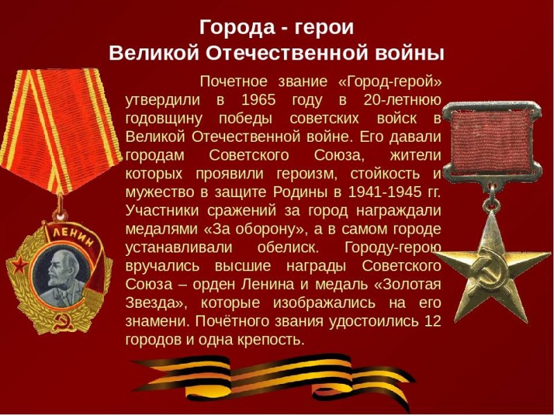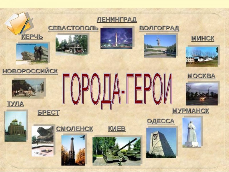 Впервые о городах-героях было сказано в приказе Верховного Главнокомандующего Вооруженными Силами СССР 1 мая 1945 года. Так были названы тогда Ленинград, Севастополь, Сталинград и Одесса. Официально звание «Город-герой» было учреждено к 20-летию Победы – 8 мая 1965 года. В этот день его присвоили Москве, Ленинграду, Волгограду, Киеву, Одессе и Севастополю, а звание «Крепость-герой» - Брестской крепости. В последующие годы званием «Город-герой» были отмечены боевые заслуги Керчи, Минска, Мурманска, Новороссийска, Смоленска, Тулы.