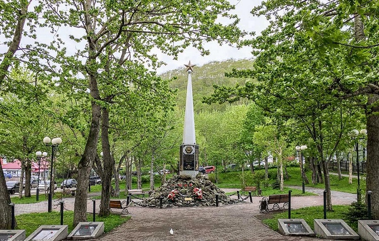 Сквер Свободы в Петропавловске. У подножия обелиска в честь воинов освободителей Сахалина и Курильских островов свежие цветы. Поч...
