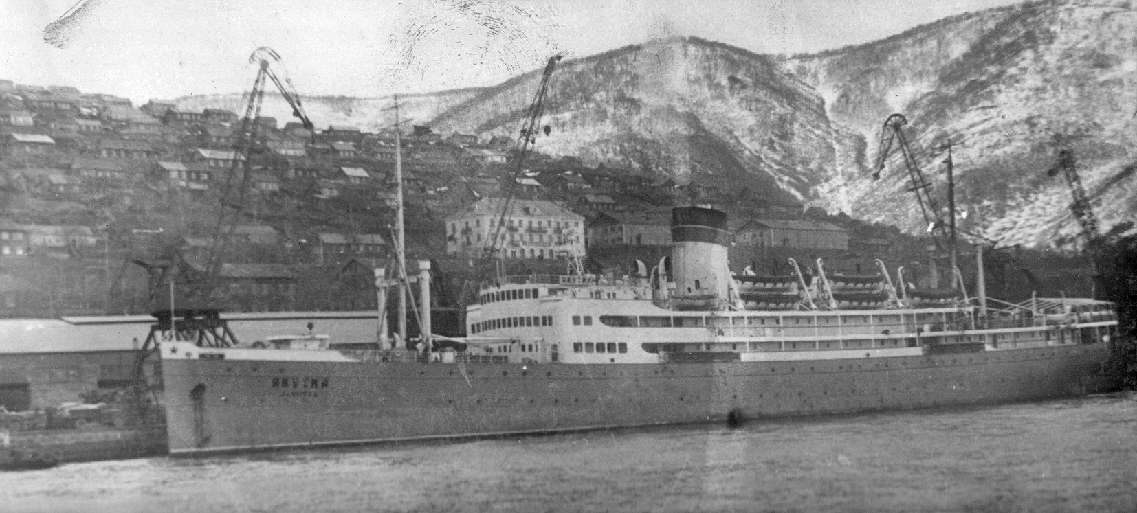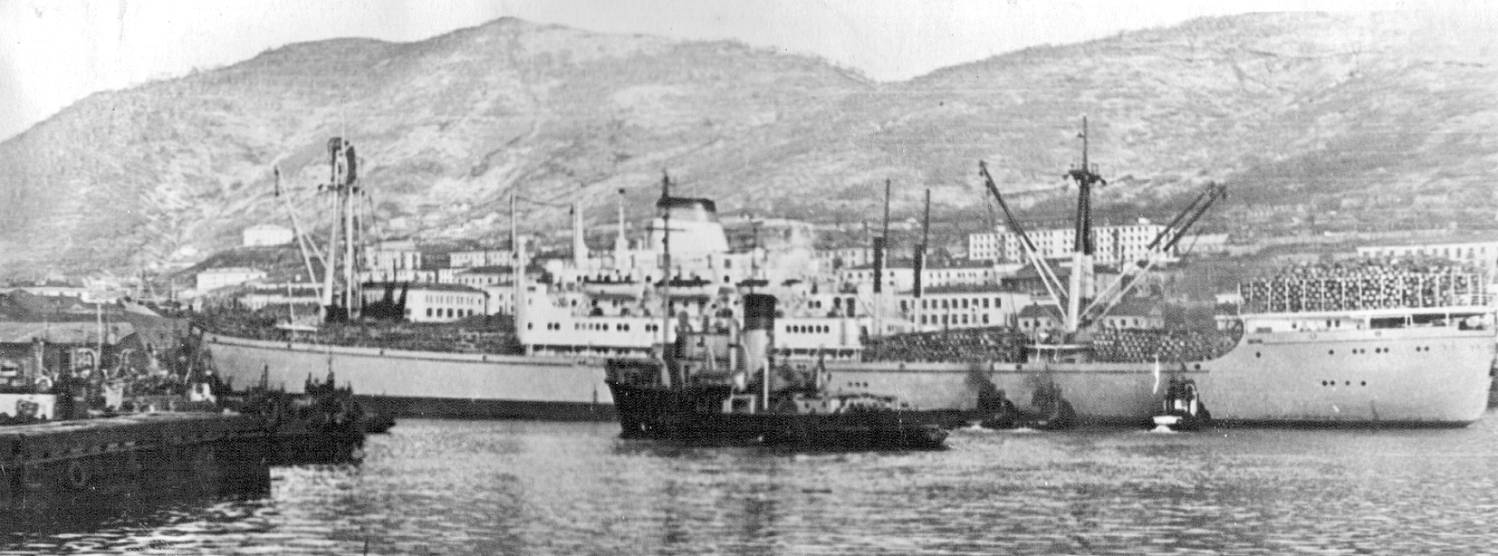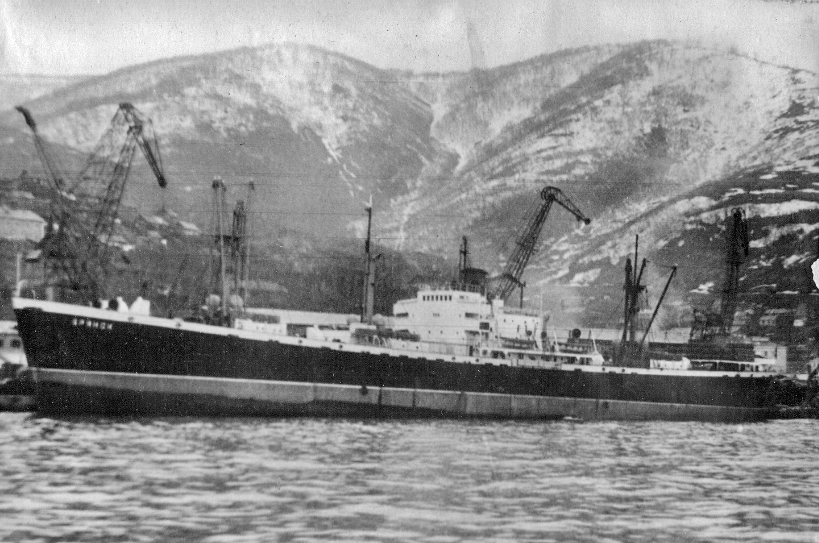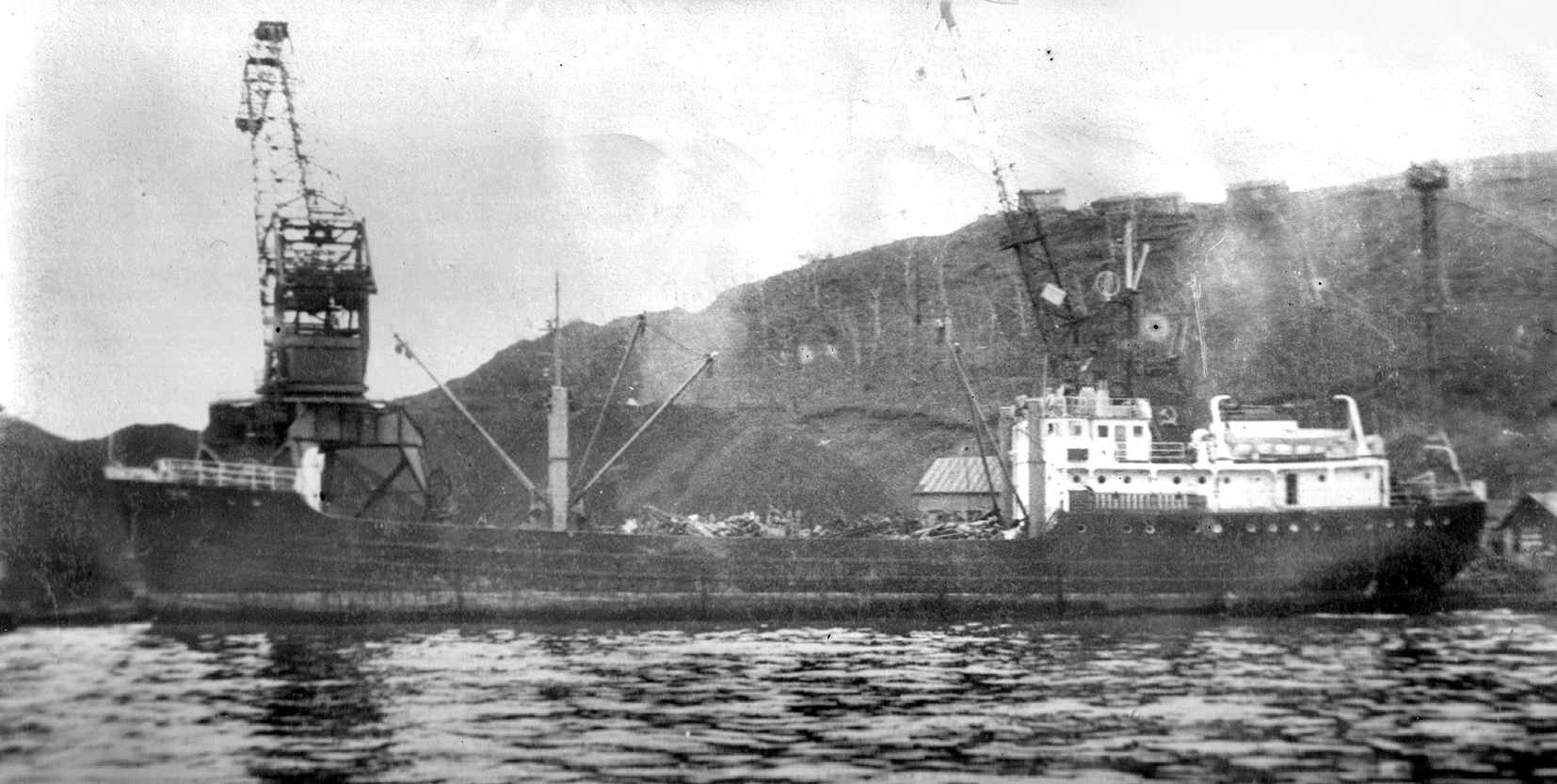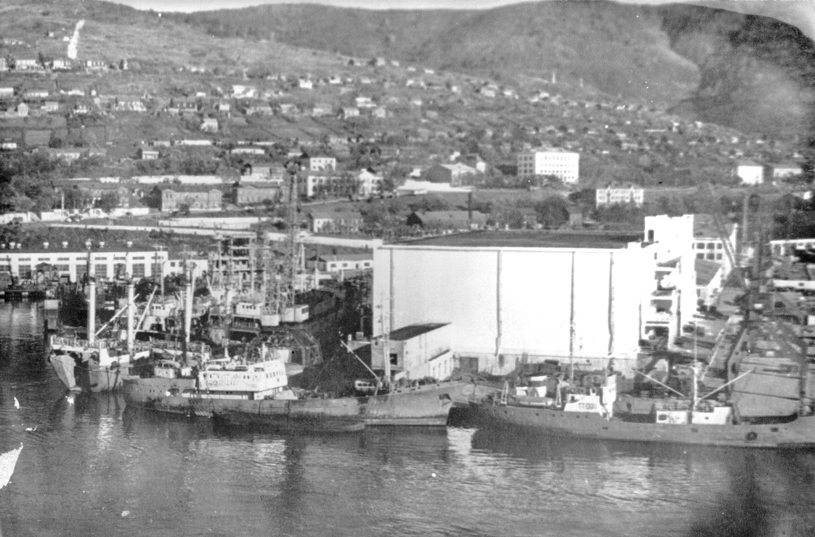 3. Пароход "Брянск" типа "Либерти" в Петропавловске. Построен в 1944 г. в США для перевозки грузов по ленд-лизу. (Тому самому, по которому тогда возили снабжение и вооружение для Красной Армии во время войны с нацизмом. А вовсе не тому ленд-лизу, объявленному недавно нашими былыми союзниками для помощи потомкам тех самых недобитых нацистов.) Принадлежал ДВГМП, затем передан в распоряжение Дальрыбы (из собрания А. А. Пирогова)