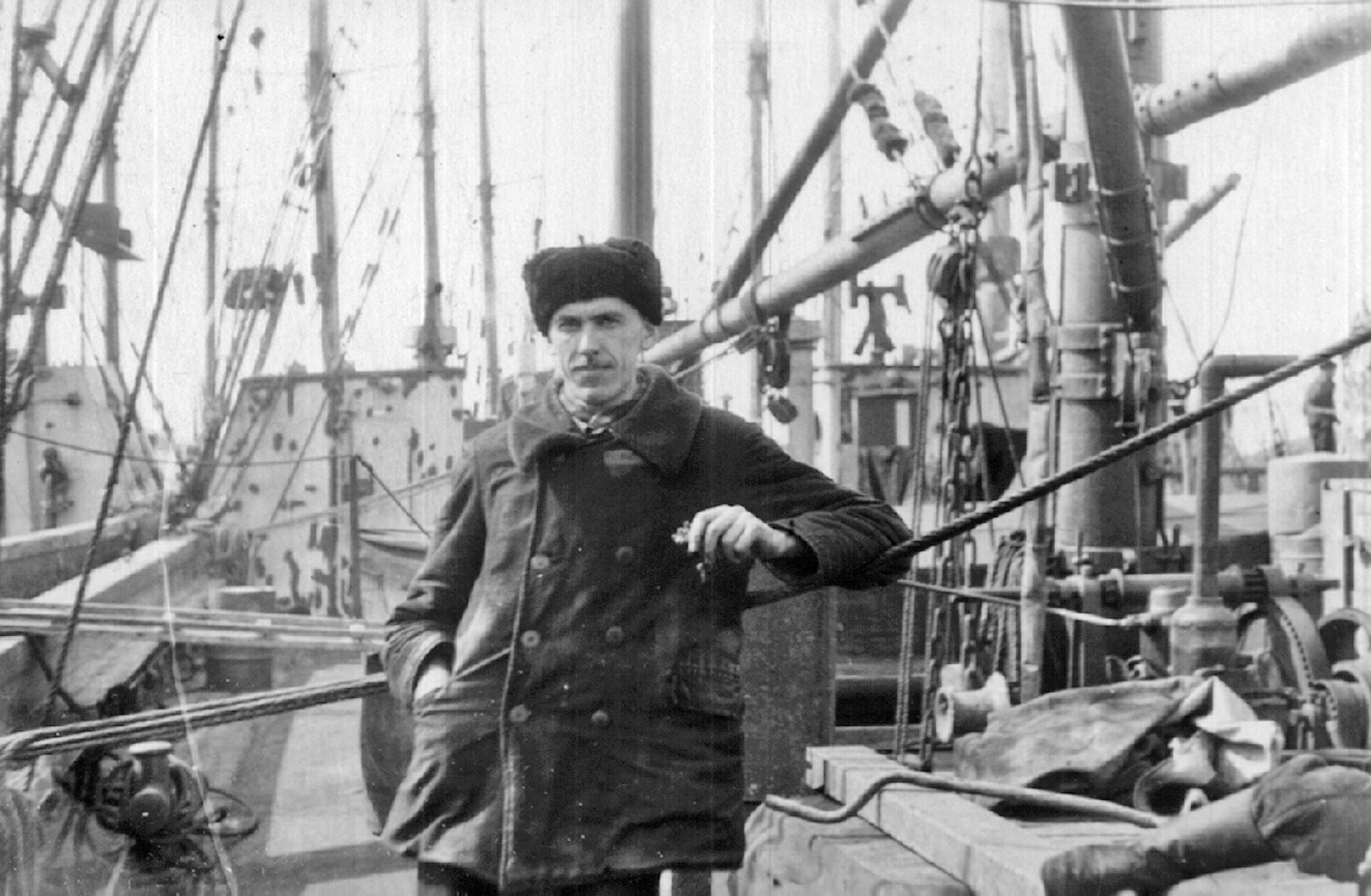 54. Старший механик парусно-моторной шхуны Камчатрыбфлота "Устрица" Георгий Борисович Рогозин на палубе, апрель 1956 г. (из собрания Г. Б. Рогозина)