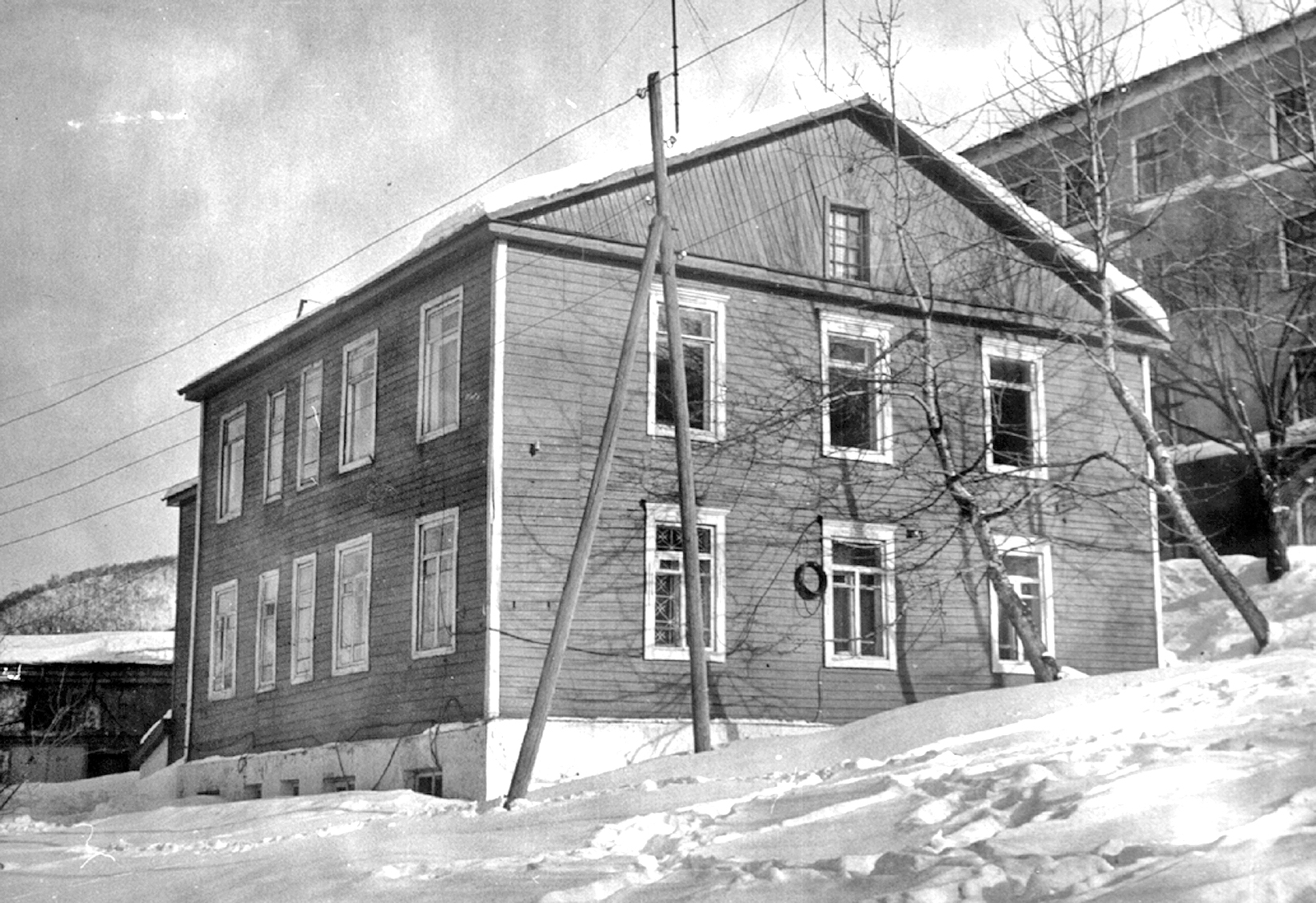 56. Здание на улице Партизанской, 9. С 1942 г. по 1945 г. здесь размещался Петропавловский моррыбтехникум, с 1949 по 1952 гг. — управление Камчатрыбфлота. Фото 1990 г. (из собрания Г. Б. Рогозина)