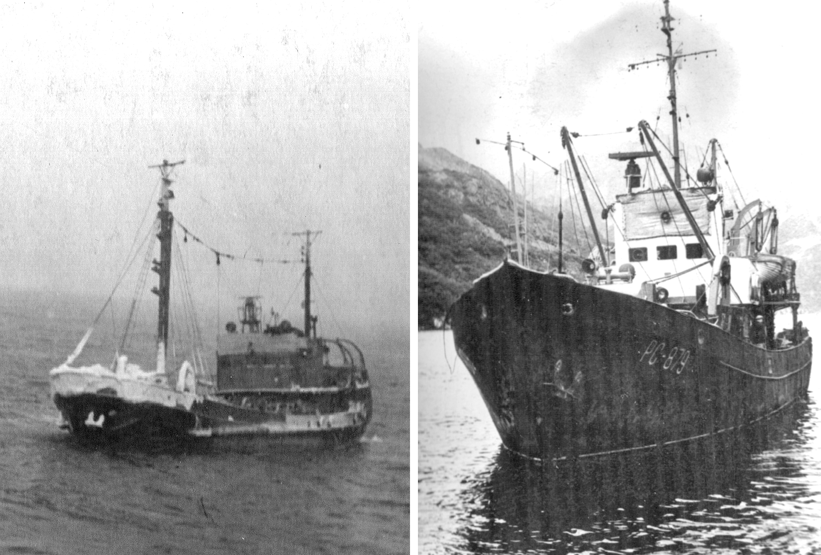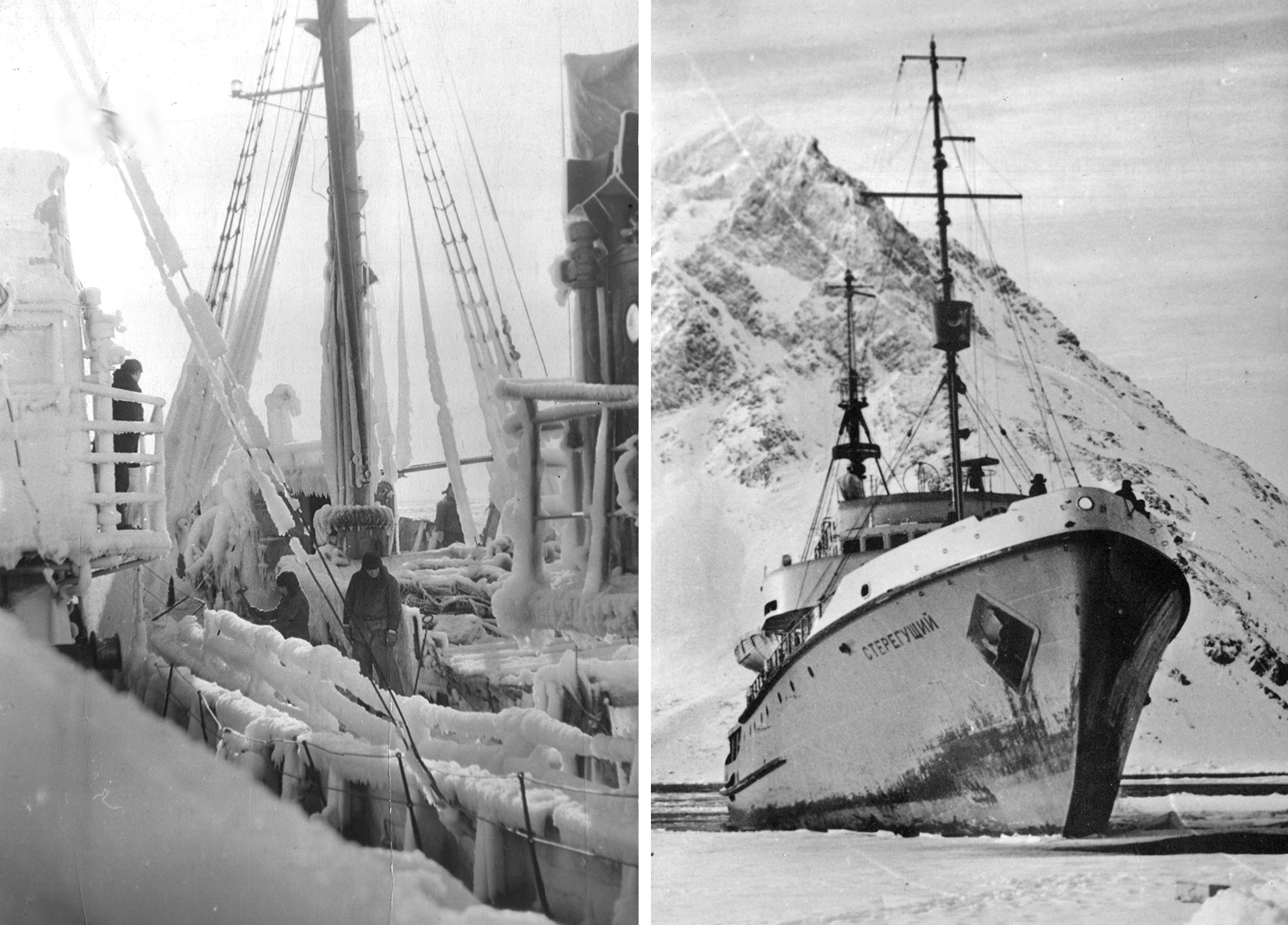 106. Слева — обледенение на СРТ "Соликамск" УТРФ Камчатрыбпрома, начало 1960-х гг. Справа — спасатель УТРФ "Стерегущий" (из собрания Ю. А. Моисеева)