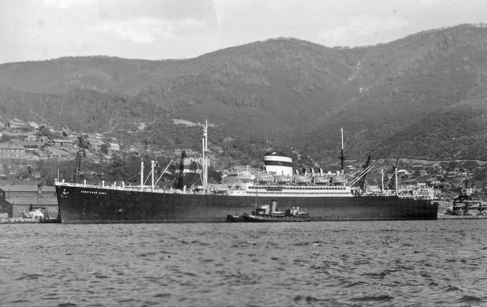 120. Пассажирский турбоход Дальневосточного государственного морского пароходства "Советский Союз". Изображения этого судна с чёрным корпусом считаются редкими. До 1959 г. (из собрания Ю. А. Моисеева)