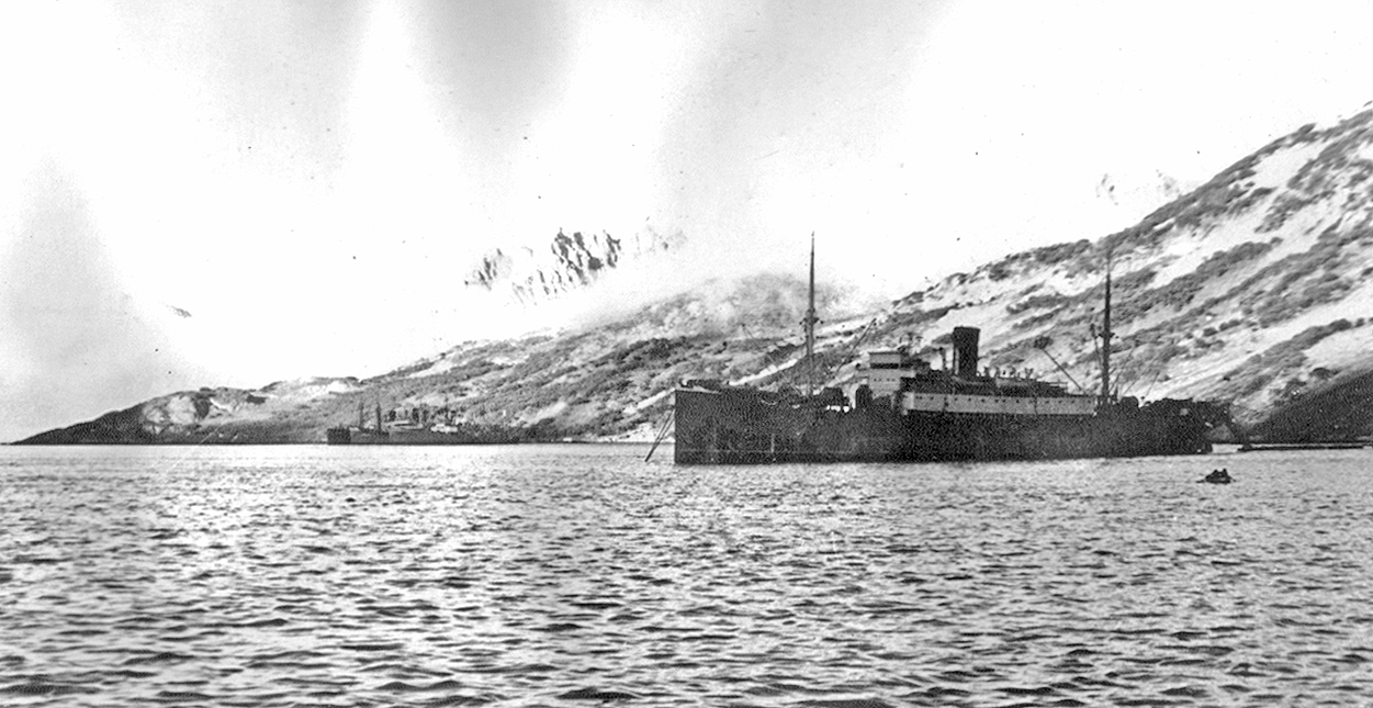 101. Самое большое судно в Наркомрыбпроме СССР в 1930—1940-х гг. пароход-рефрижератор "Пищевая индустрия" в бухте Южно-Глубокой (из собрания Ю. А. Моисеева)