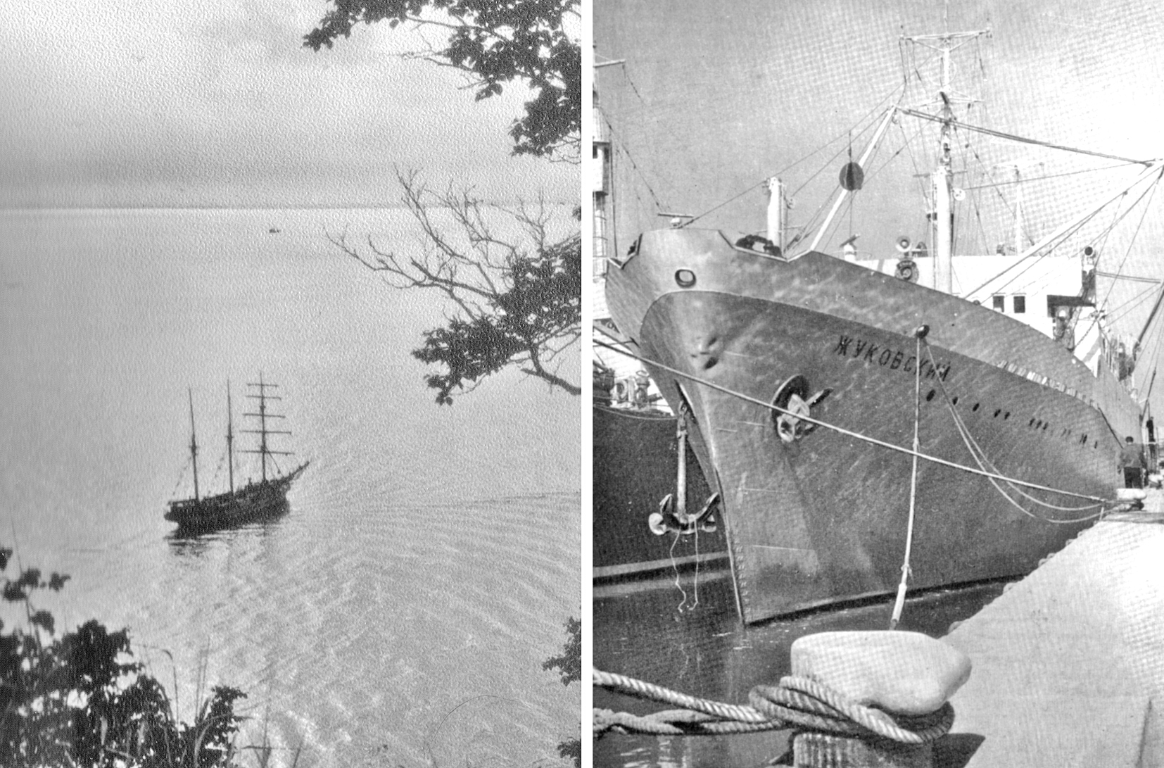 72. Старое и новое: парусно-моторная баркентина и БМРТ "Жуковский" (из собрания Ю. А. Моисеева)
