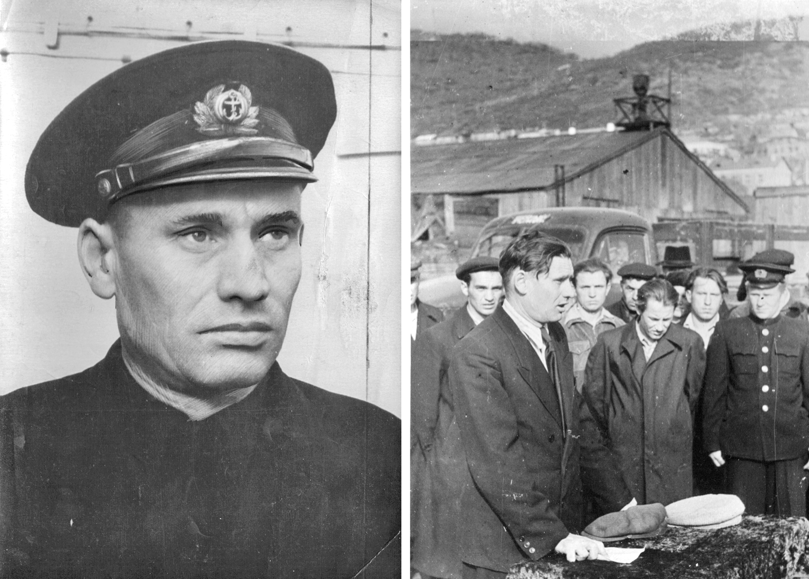 74. А. Н. Моисеев, капитан СРТ "Камчадал", 1952 г. (слева). Речь А. Н. Моисеева на встрече СРТ-4336 с рекордным уловом в 10 000 ц, 10 октября 1957 г. (из собрания Ю. А. Моисеева)