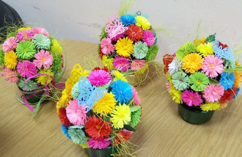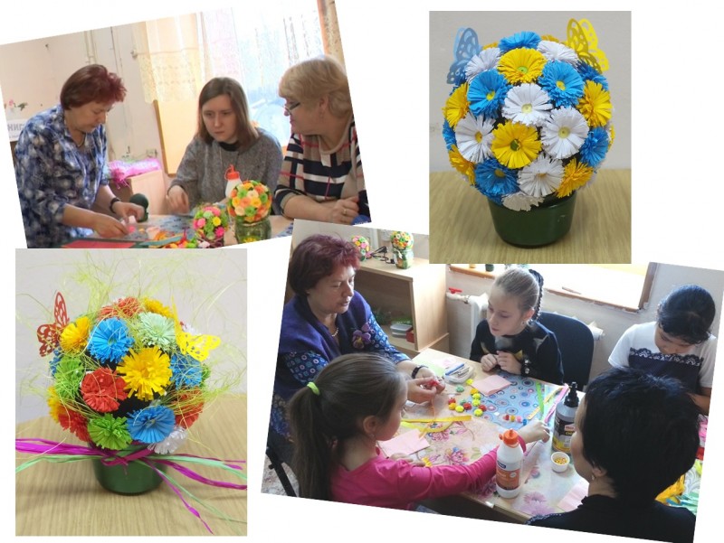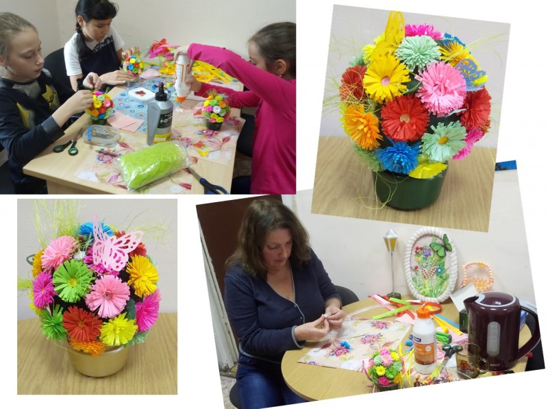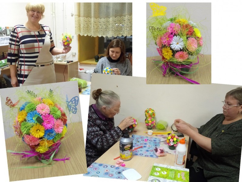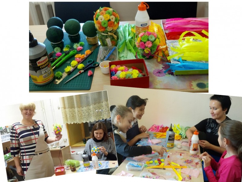 В этом месяце заседания клуба «Мастерская Чудес» проходили в форме творческих уроков. Мы мастерили. Цветная бумага, клей, ножницы, фантазия, радость от творческого процесса и наш яркий цветочный шар готов!