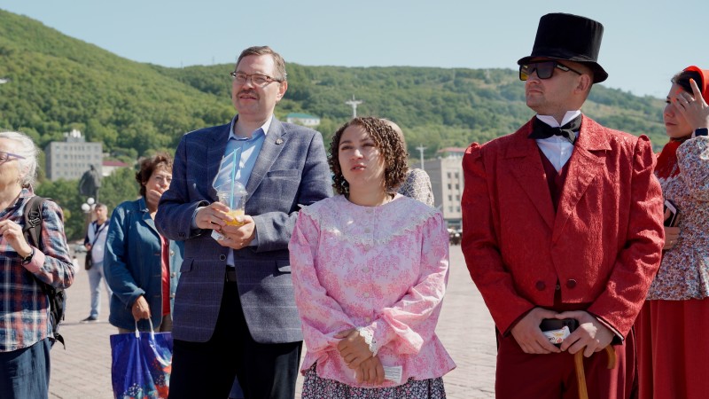 Костюмы 19 века, в которые были одеты участники студии, привлекли всеобщее внимание, горожане с интересом рассматривали актеров и многие с удовольствием фотографировались на память.