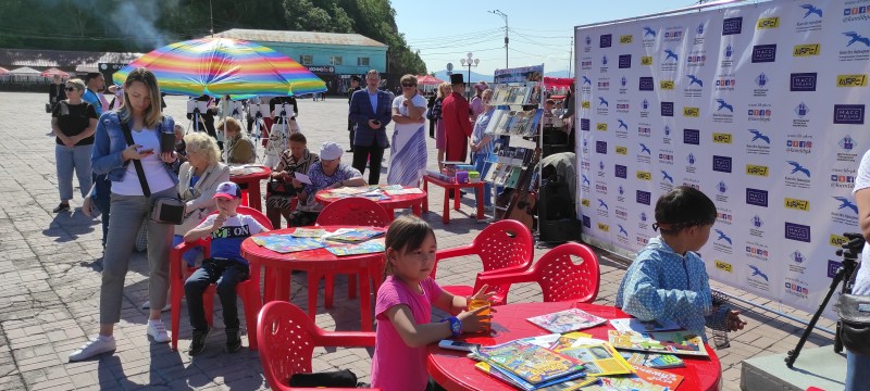 На площади развернулся летний читальный зал, приглашая гостей отдохнуть, почитать и послушать музыку.