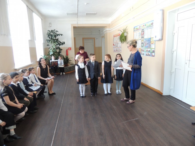 Затем ведущая с ребятами совершила путешествие по сказкам. Дети отвечали на вопросы сказочных викторин «Угадай героя», «Волшебные предметы». Далее дети заглянули в мир произведений Корнея Ивановича Чуковского. Потом дорога привела ребят к рассказам Николая Носова. Дети отвечали на вопросы викторин по рассказам: «Огурцы», «Живая шляпа», «На горке», «Замазка», «Фантазеры» и др. Двигаясь дальше открыли книги Сергея Михалкова и ребята с удовольствием прочитали его стихи наизусть. Затем первоклассники познакомились с произведениями Самуила Яковлевича Маршака, а по стихотворению «Кот и лодыри» дети показали театрализованную сценку.