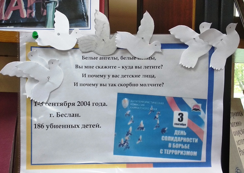Каждый читатель, пришедший в городскую библиотеку №2 с 1 по 10 сентября становится участником Акции "Нет террору!" На выставке, посвященной борьбе с терроризмом размещен плакат, куда каждый желающий сможет прикрепить изображение голубя - символ мира и доброй воли.