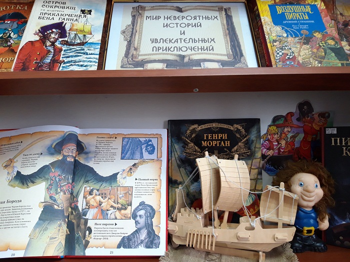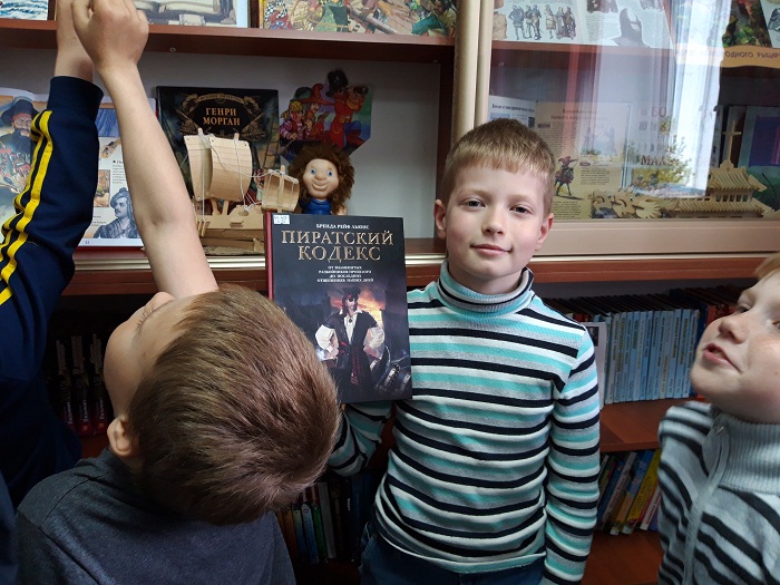 Для ребят в библиотеке №5 была подготовлена книжно-предметная выставка. Из представленных на ней книг и энциклопедий можно узнать об истории пиратства с древних времен, таинственных кладах и захватывающих путешествиях. Ребята вспомнили героев любимых книг: "Остров сокровищ" Роберта Стивенсона, "Одиссея капитана Блада" Рафаэля Сабатини и др. Особое внимание мальчишек привлек "Пиратский кодекс".