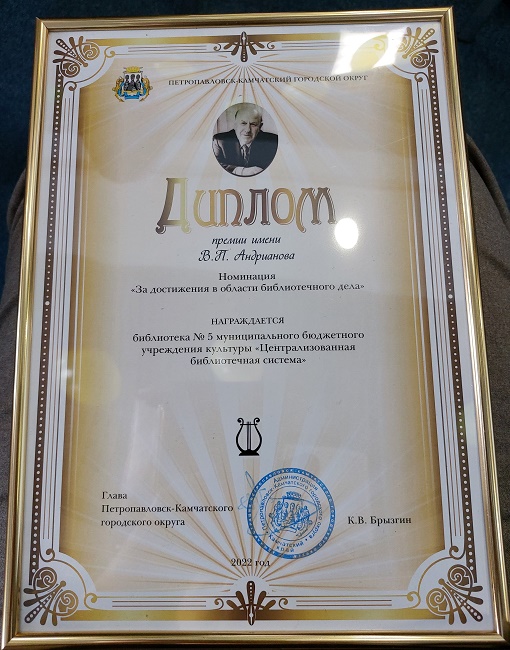 За достижения в области библиотечного дела премии им. В.П. Андрианова был удостоен коллектив библиотеки №5 Муниципального Бюджетного Учреждения Культуры "Централизованная библиотечная система" г. Петропавловска-Камчатского, который в течение многих лет занимается программно-проектной деятельностью, благодаря чему работа библиотеки имеет чёткое направление и перспективы эффективного развития.