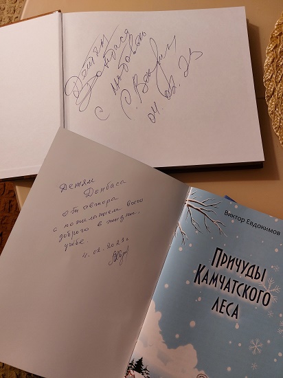 Трогательные слова поддержки и пожелания детям Донбасса оставил на своей книге Виктор Алексеевич Евдокимов - автор многих произведений о Камчатке, адресованных, прежде всего, читателям детского возраста.