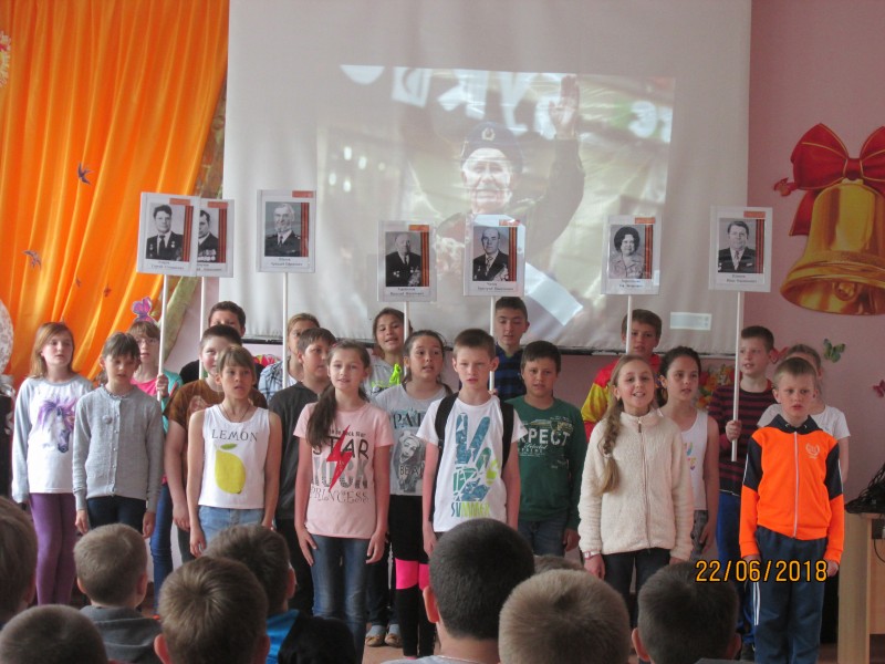 Завершающим аккордом стало выступление старшего отряда. Ребята пели о прадедушках, сохранивших им жизнь, держа в руках портреты бойцов «Бессмертного полка».