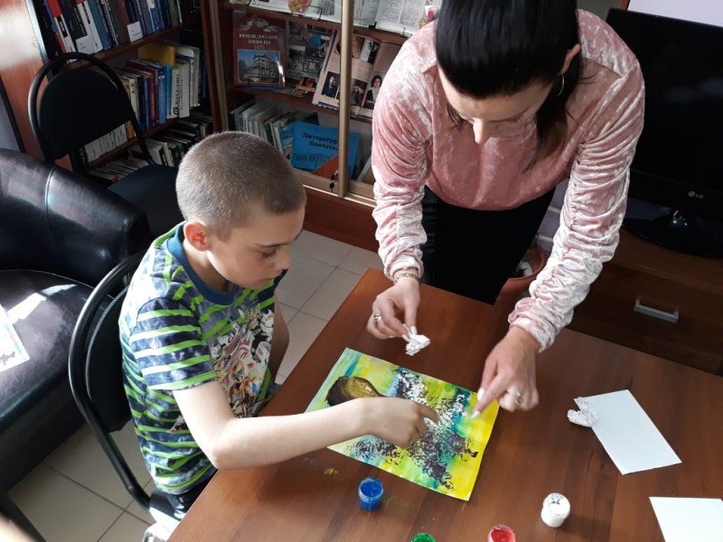 Успешно продолжается наша постоянная совместная работа с филиалом №5. Творческие занятия библиотечного кружка «Учусь быть читателем»библиотеки №5 и клуба «Палитра» библиотеки №9 дают успешные результаты. 28 мая мы осваивали нетрадиционную технику рисования мятой бумагой.