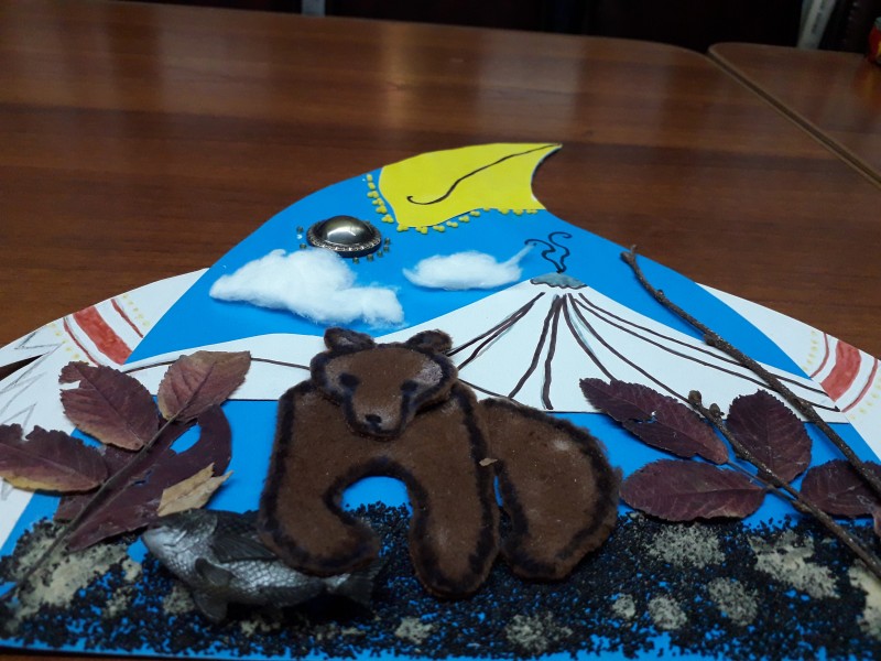 Самобытная работа «Моя Камчатка»: под крылом Кутха охотится хозяин камчатских лесов на лосося. Аппликация из фетра, бисера и сухоцветов.